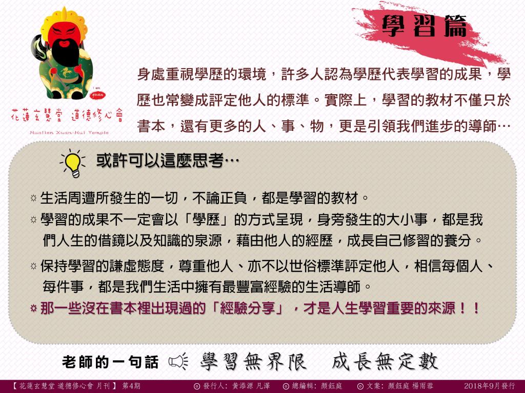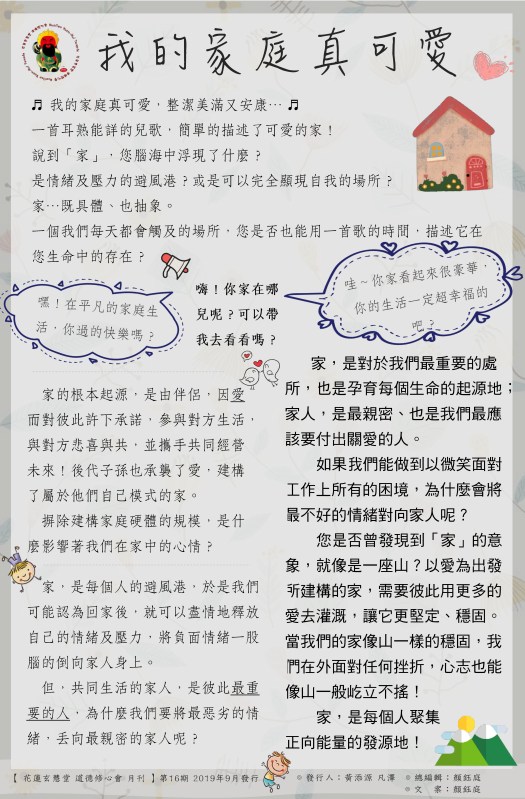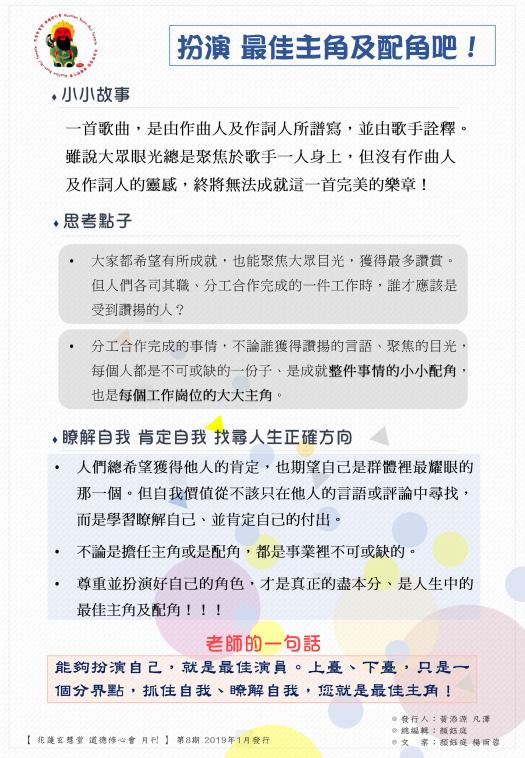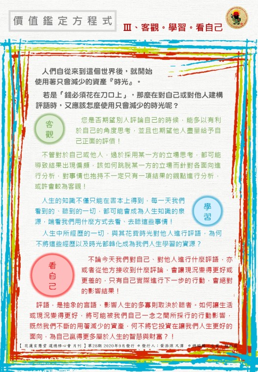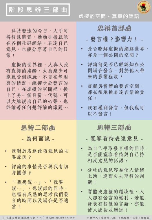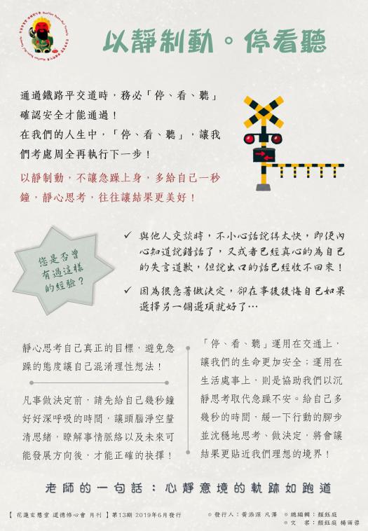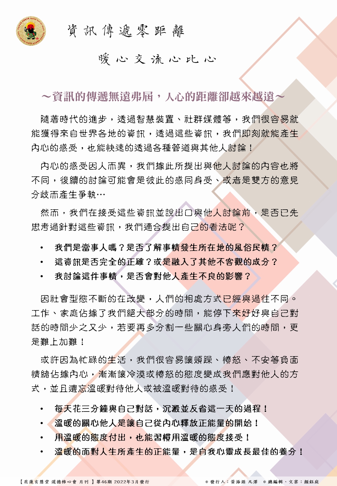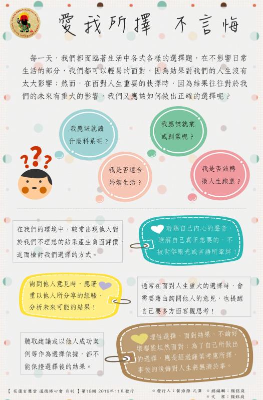 【花蓮玄慧堂 道德修心會】月刊,期望分享同修日常生活所遇到之困境,另外,也向大眾分享反向思考觀點,意屬宣達善知識及善經驗等相關訊息,以傳達正向能量予大眾,期盼大眾能以多方位思考取得平衡點,現實回歸平和!