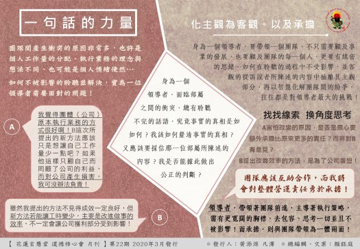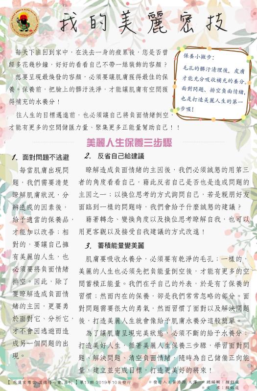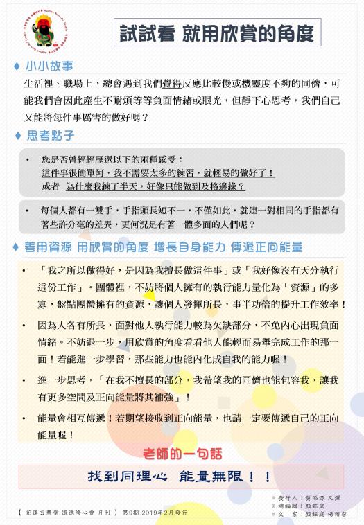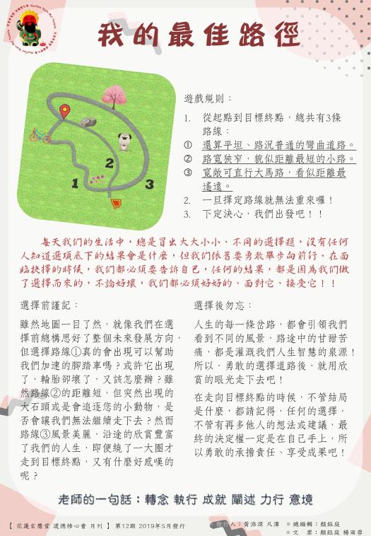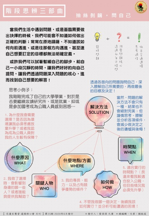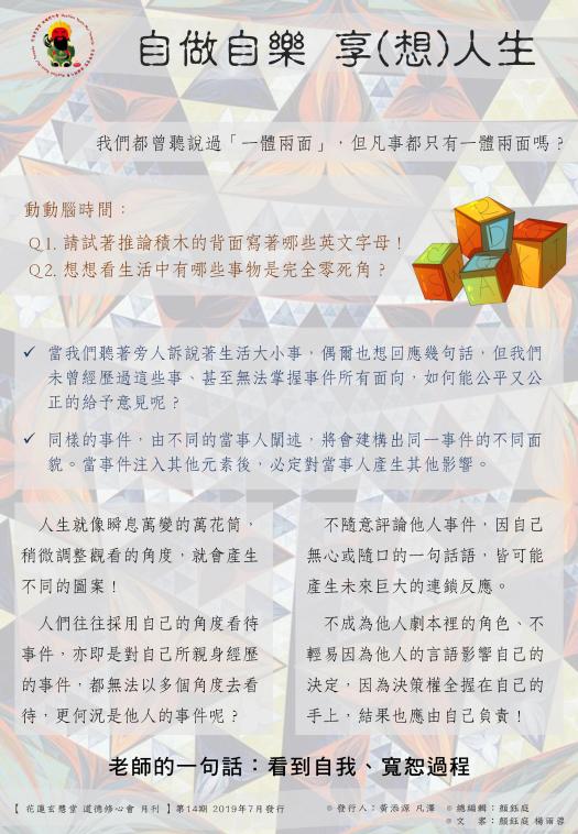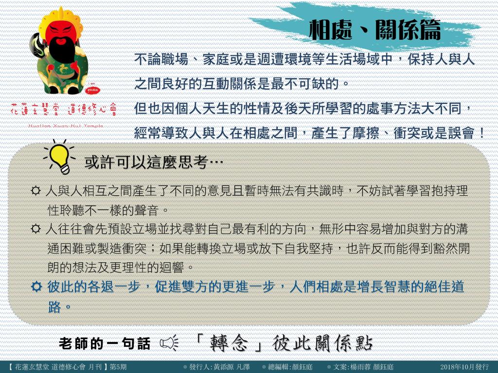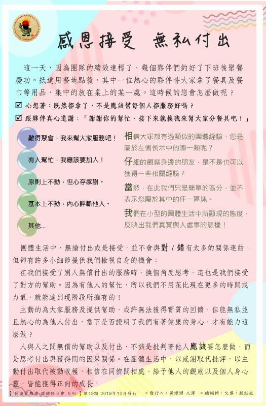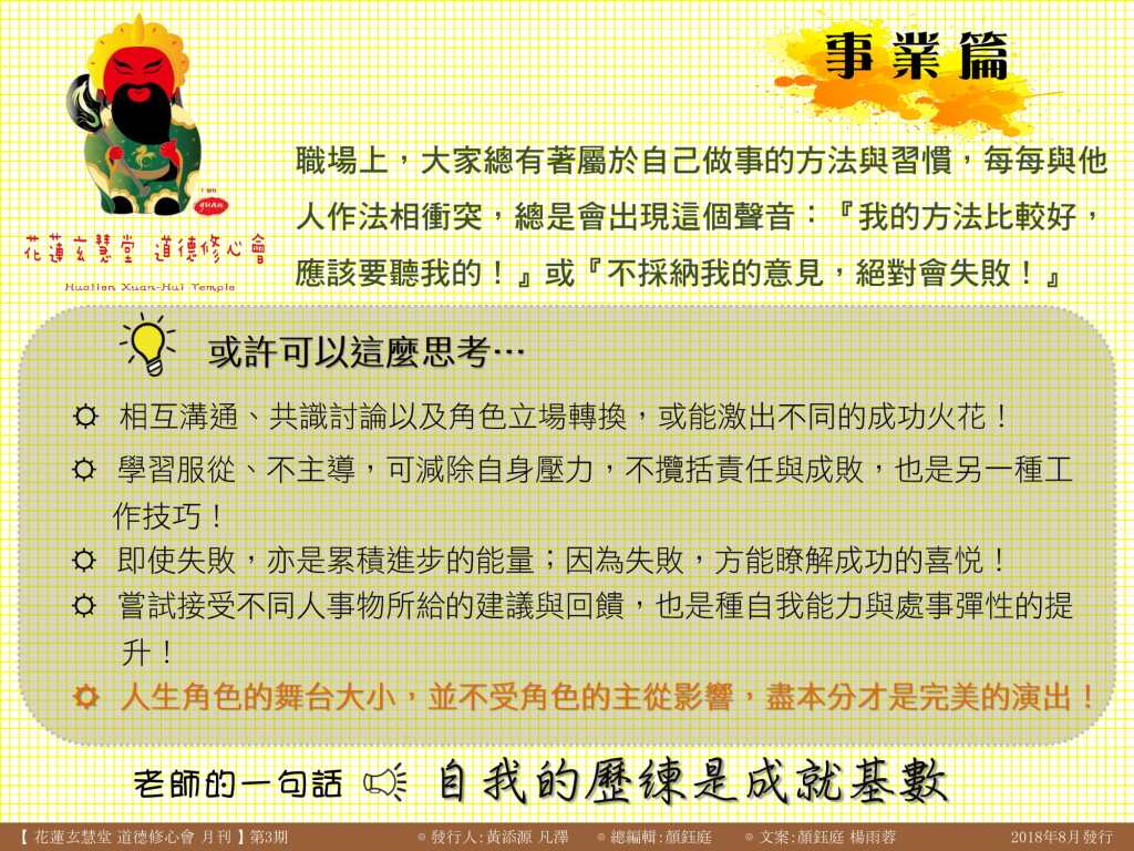 【花蓮玄慧堂 道德修心會】月刊,期望分享同修日常生活所遇到之困境,另外,也向大眾分享反向思考觀點,意屬宣達善知識及善經驗等相關訊息,以傳達正向能量予大眾,期盼大眾能以多方位思考取得平衡點,現實回歸平和!