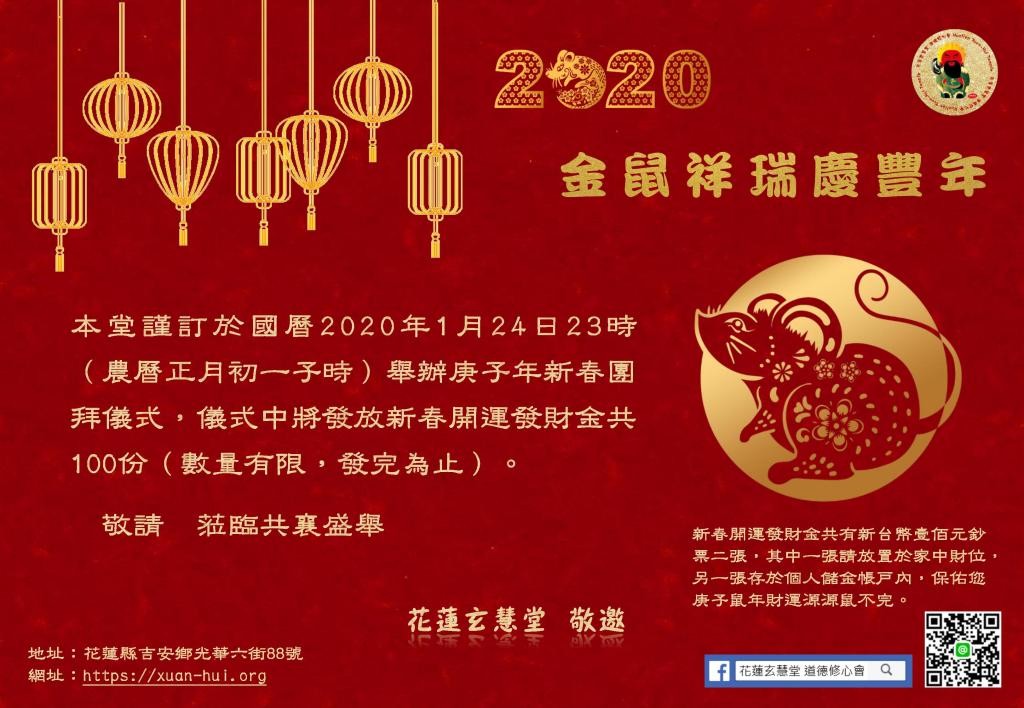 花蓮玄慧堂於2020年1月24日23時(農曆庚子年正月初一子時)舉辦庚子年新春團拜儀式,由玄慧堂凡澤老師帶領佛堂師兄、師姐以及各地前來參拜之信眾,誠心向玉皇上帝祈求庇佑闔家和樂平安、諸學子學業有成、各信眾事業昌隆、庚子年金鼠祥瑞慶豐年!